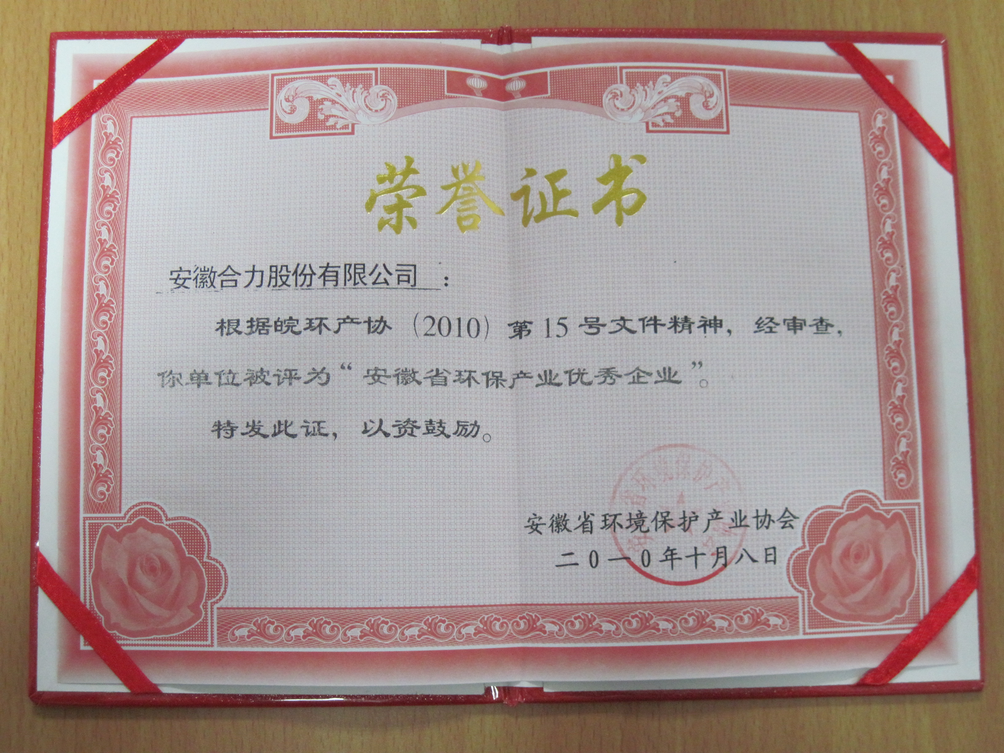 2010 安徽省環(huán)保企業(yè)優(yōu)秀企業(yè)證書(shū)